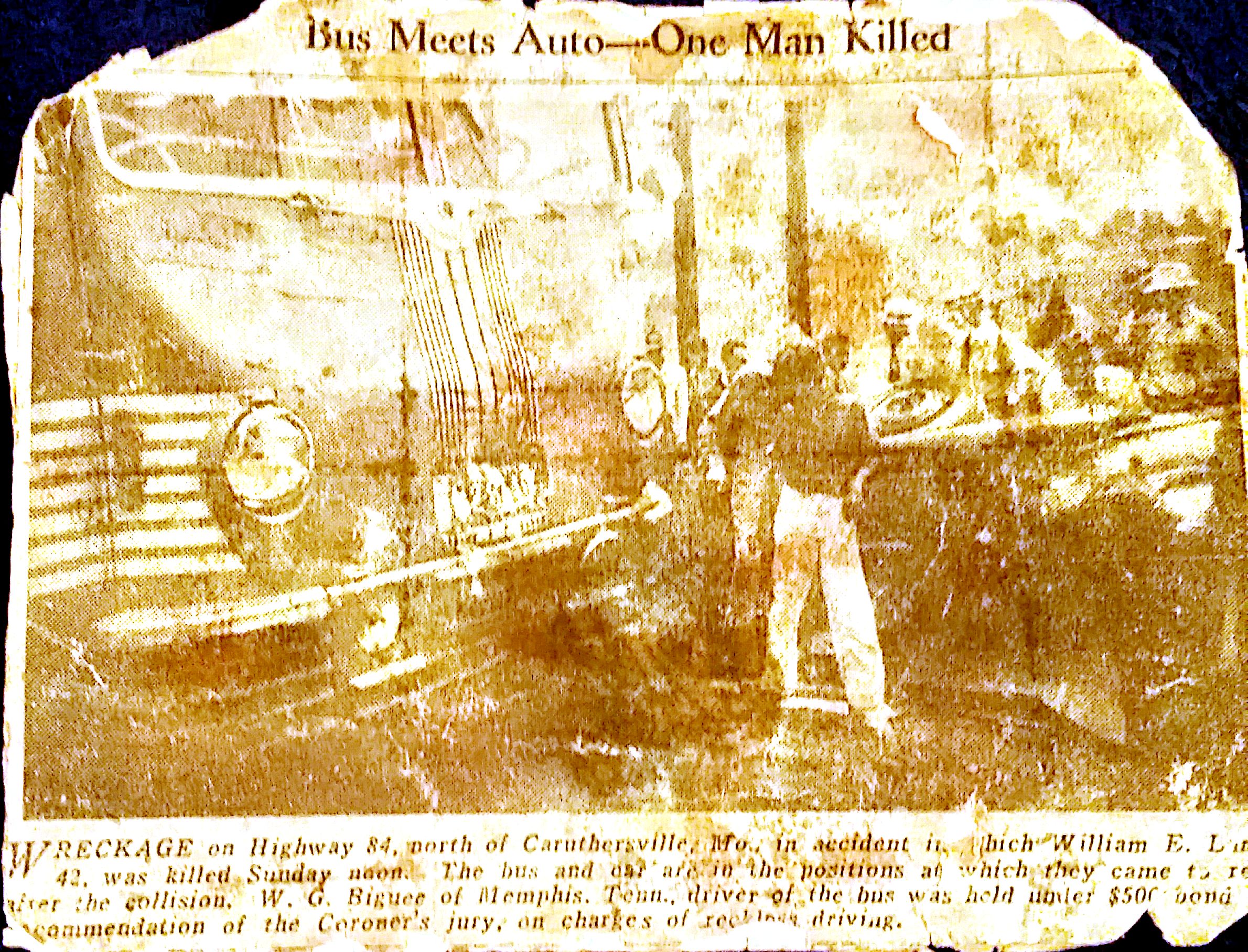 Grandpa Lane’s life abruptly came to an end on Sunday, June 4, 1939, around noon, when the car he was driving collided with a Greyhound bus just north of Caruthersville at the intersection of Highway 84 and Ferry Road. Much of what I know about the accident came from articles that appeared in The Republican and Democrat Argus, both newspapers in Caruthersville at the time.