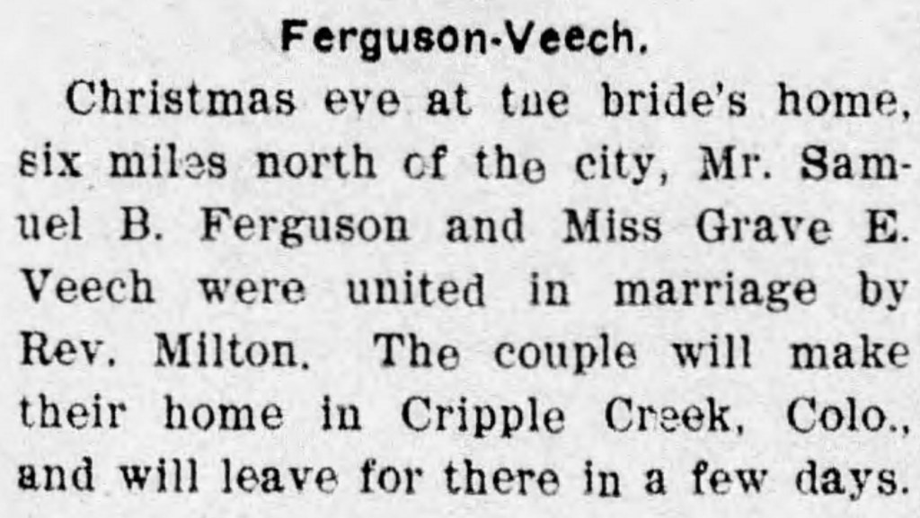 It can be deduced from these two articles that Tom and Lola Ferguson probably moved to the Cripple Creek area of Colorado and his brother Samuel and his new bride Grace (once again an error in reporting) joined them a little more than a year later. I found from further research Tom and Lola were back in Fort Scott in 1904; and Samuel and Grace in 1905.