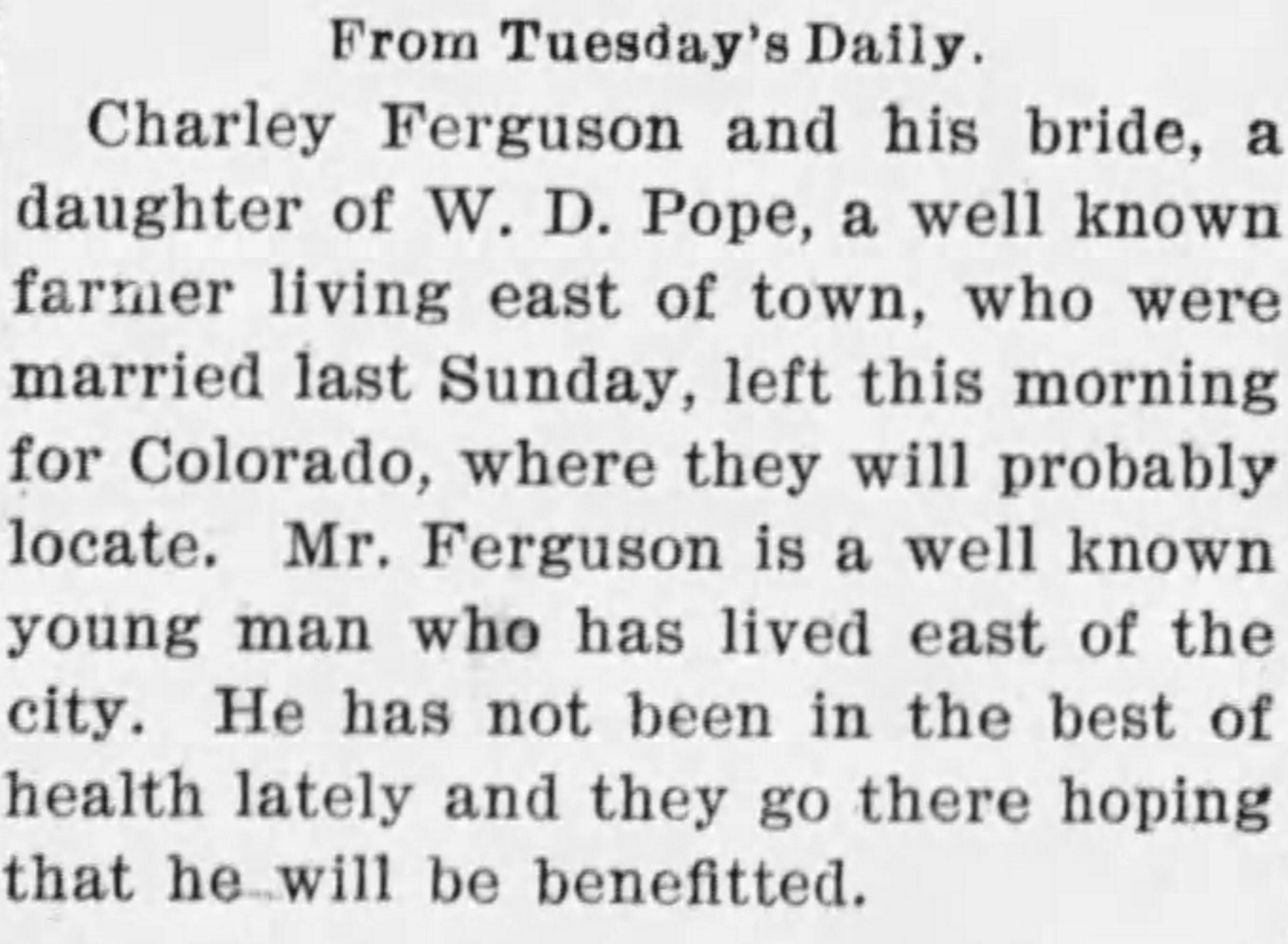 Fast forward to now and I have learned through historical newspapers that the Fergusons left for Colorado five days after their marriage, on 15 Aug 1901.¹ The newspaper got Tom’s name wrong in the article. Even though Lola’s name wasn’t mentioned her father went by W. D. Pope so it can be determined that this is our couple. Why someone would take a job working on a ranch while not being in the best of health is another question with no answer.