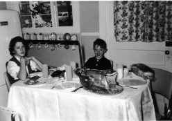 In the picture below, we are celebrating Christmas Day taken in 1958. I was eleven years old. My brother, Bill, was nine. You can see the turkey on the table. My mother always bought a turkey to feed a family of fifteen rather than four. Turkey sandwiches were on the menu for lunch for several days afterward.
