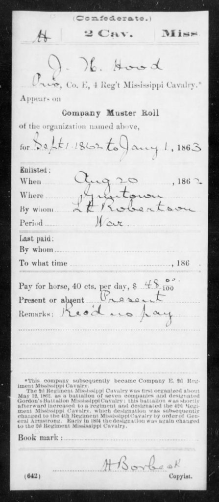 On 20 Aug 1862, J. H. Hood was mustered in again at Guntown as a private in Company E of the 4th Regiment of the Mississippi Calvary from 1 Sep 1862 to 1 Jan 1863 serving under Lt. Robertson. ⁴