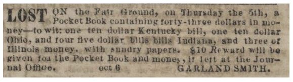 “LOST ON the Fair Ground, on Thursday the 5th, a Pocket Book containing forty-three dollars in money—to wit: one ten dollar Kentucky bill, one ten dollar Ohio, and four five dollar bills bills Indiana, and three of Illinois money, with sundry papers. $10 Reward will be given for the Pocket book and money, if left at the Journal Office.”