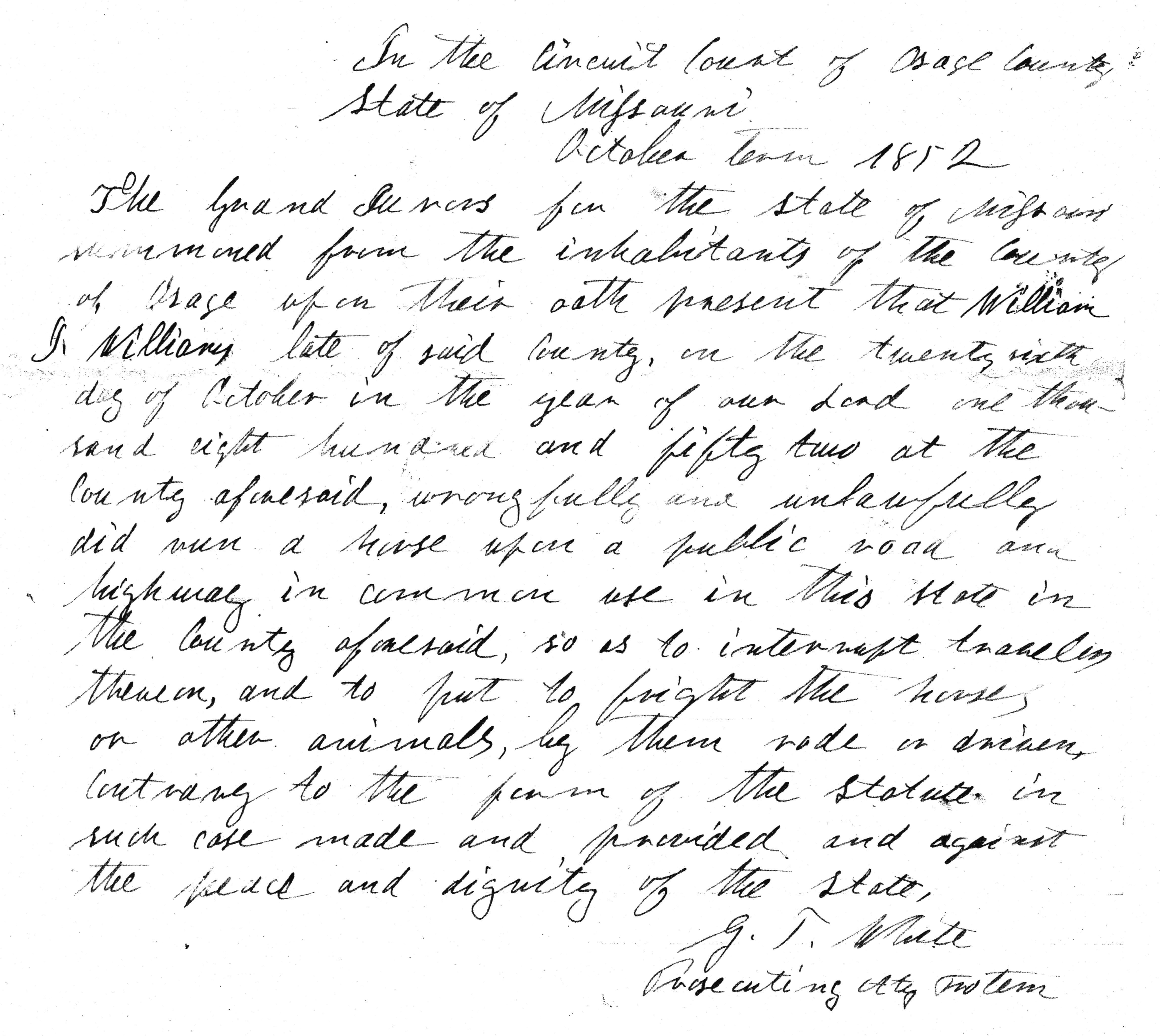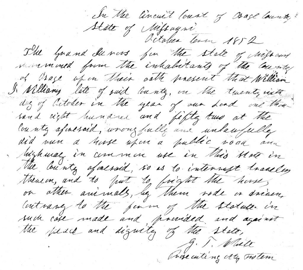 My great-great-grandfather, William Jefferson Williams (Jeff Williams), was indicted by the state of Missouri for running his horse on a public highway in 1852. His case was taken before the grand jury of the County of Osage, Missouri, where they found that on October 26, 1852, Jeff Williams “wrongfully and unlawfully did run his horse upon a public road and highway in common use in this state in the county aforesaid, so as to interrupt traveling therein, and to put to fright the horses or other animals, by them rode or driven, contrary to form of the statute in such case made and provided and against the peace and dignity of the state.” ¹