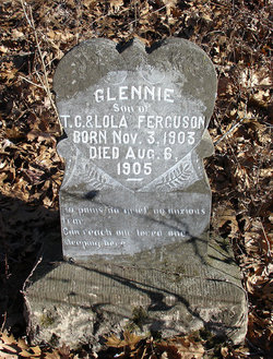 The most poignant burial in Coleman Cemetery is that of Glen Everett Ferguson. Glennie was the son of Tom and Lola (Pope) Ferguson, the grandson of Thomas Bunn Ferguson, and great-grandson of Augustus Baker. He died at the age of two from a large tumor on the side of his neck. His little headstone lies next to that of his grandfather.