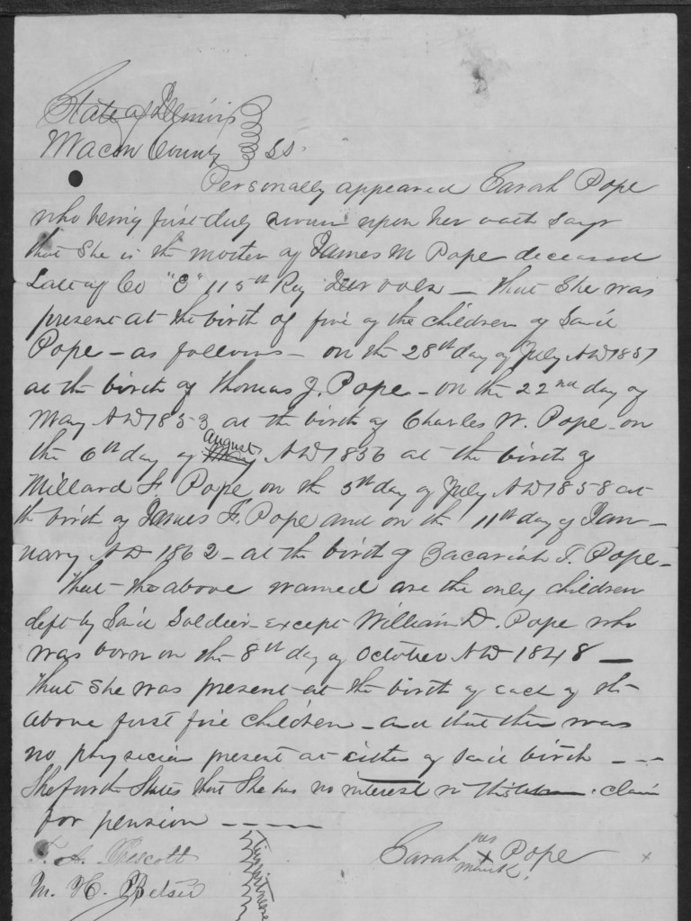 “Personally appeared Sarah Pope who being first truly sworn upon her oath says that she is the mother of James M. Pope deceased late of Co. “E” 115th Reg. Ill. Vols – that she was present at the birth of five children of said Pope as follows, on the 28th day of July AD 1857 at the birth of Thomas J. Pope, on the 22nd day of May AD 1853 at the birth of Charles W. Pope, on the 6th day of August AD 1856 at the birth of Millard F. Pope, on the 5th day of July AD 1858 at the birth of James F. Pope, and on the 11th day of January AD 1862 at the birth of Zachariah J. Pope. The above-named are the only children of said soldier except William D. Pope who was born on the 8th day of October AD 1848. She was present at the birth of each of the above first five children and there was no physician present at either of said births.”