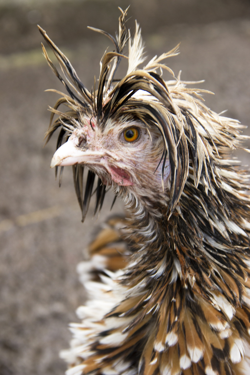 A free range Frizzled Tolbunt Polish hen after being caught in the rain.