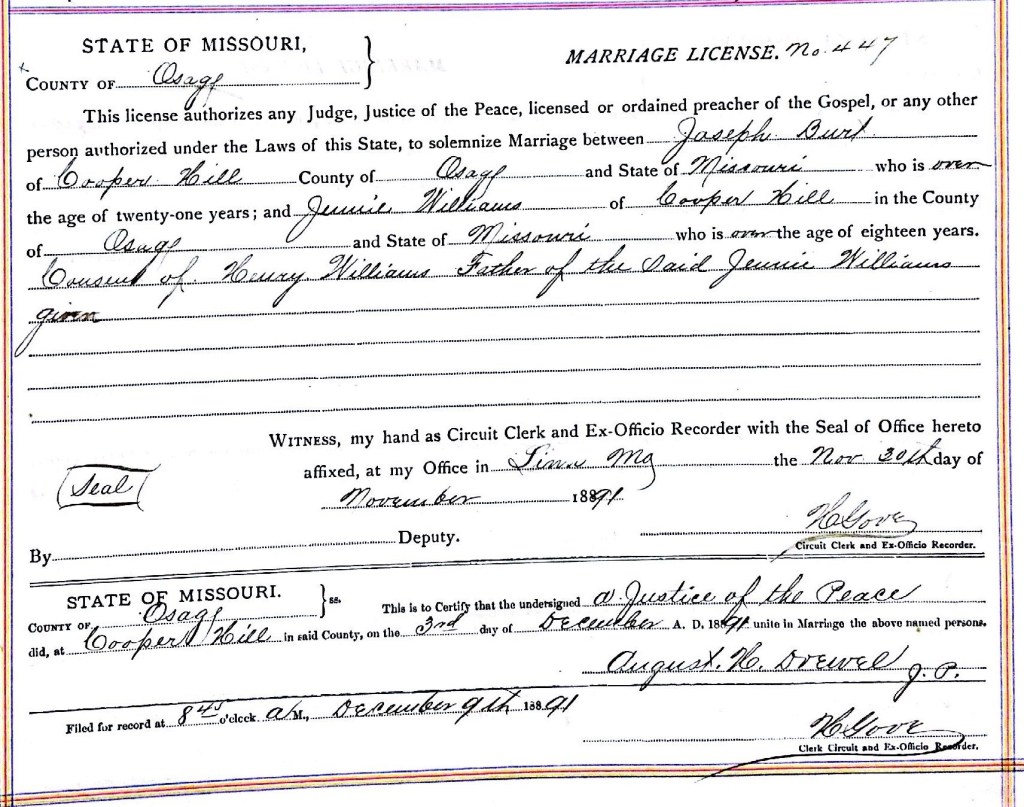 On 3 Dec 1891, Jennie and Joseph Burt were married in Cooper Hill, Osage County by a Justice of the Peace. She was twenty-two and he was twenty-six.